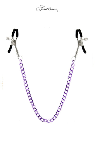 Deux pinces à seins fixées à une chainette en acier coloré, pour stimuler les tétons de votre partenaire, par Sweet Caress.