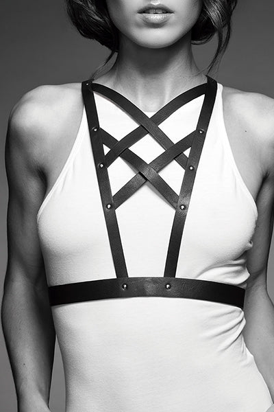 Un harnais, d'inspiration BDSM, qui met en valeur votre poitrine et se marie parfaitement avec vos plus beaux ensembles, votre lingerie ou à même la peau.