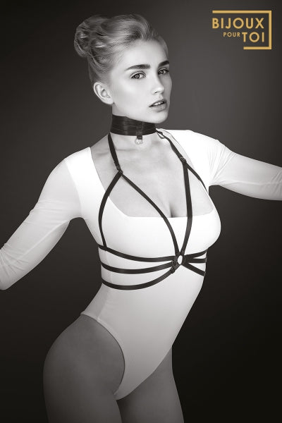 Le harnais Julia, de la marque Bijoux Pour Toi, est un harnais en deux parties: un harnais de buste de style Fetish SM soft, et un tour de cou assorti. L'ensemble est très tendance et glamour, et sublime votre poitrine et votre cou.