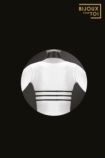 Le harnais de buste Julia et son tour de cou sont composés de lanières douces et élastiques noires. Chacune des deux pièces peut se porter séparément. Le harnais galbe votre poitrine et s'ajuste facilement dans le dos grâce à ses attaches coulissantes. Le tour de cou est également réglable.