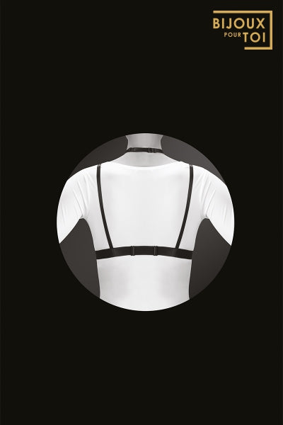 Ce harnais de poitrine, en matière élastique, se porte sur vos vêtements, vos dessous ou à même le corps et vous donnera un look Fetish Glamour qui charmera votre entourage, que ce soit en public ou dans l'intimité.