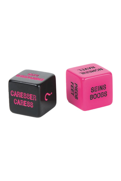 1 Paire de dés coquins: l'un est noir et vous propose des gages tels que caresser, embrasser, surprise et autres. L'autre est rose et désigne des régions de votre anatomie - les seins, les pieds, la bouche