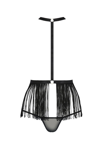 Cet ensemble deux pièces se compose dune jupe à franges et dun string sexy en tulle.