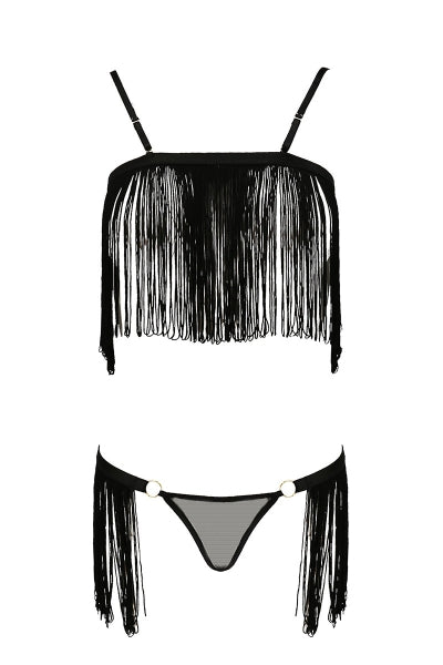 Le string réglable à larrière présente des franges sur les hanches rappelant le haut de la tenue. Le string dissimule lintimité grâce à un tissu en fin tulle noir et les hanches sont habillées par de fines franges noires.