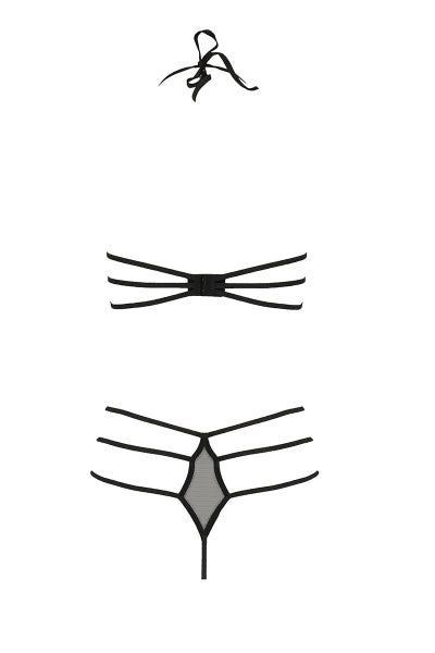 Cette tenue en fines lanières noire et tulle se compose d'un soutien-gorge et d'un string très sensuels.