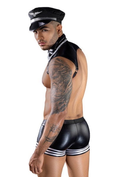 Ce déguisement J Lingerie est composé d'un boxer noir avec rayures argentées en vinyle extensible, d'une casquette d'officier de l'aviation, d'une cravate avec col intégré et d'un harnais type double holster.