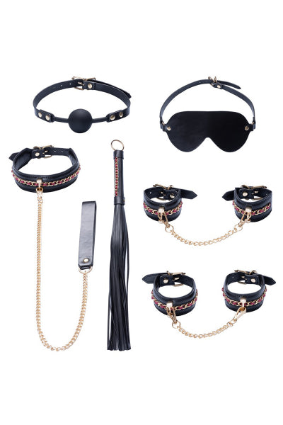 Ce Kit BDSM de Bad Kitty est composé de 7 pièces, en similicuir noir élégant avec des accessoires dorés et des accents rouges.
