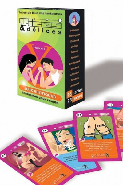 Vices et Délices, un tourbillon de fantasmes, 76 gages pour jouer à deux ou plus... 3 degrés de difficultés : vert, bleu, orange, pour s'éclater sexuellement! Oserez vous jouer les cartes de couleur orange?